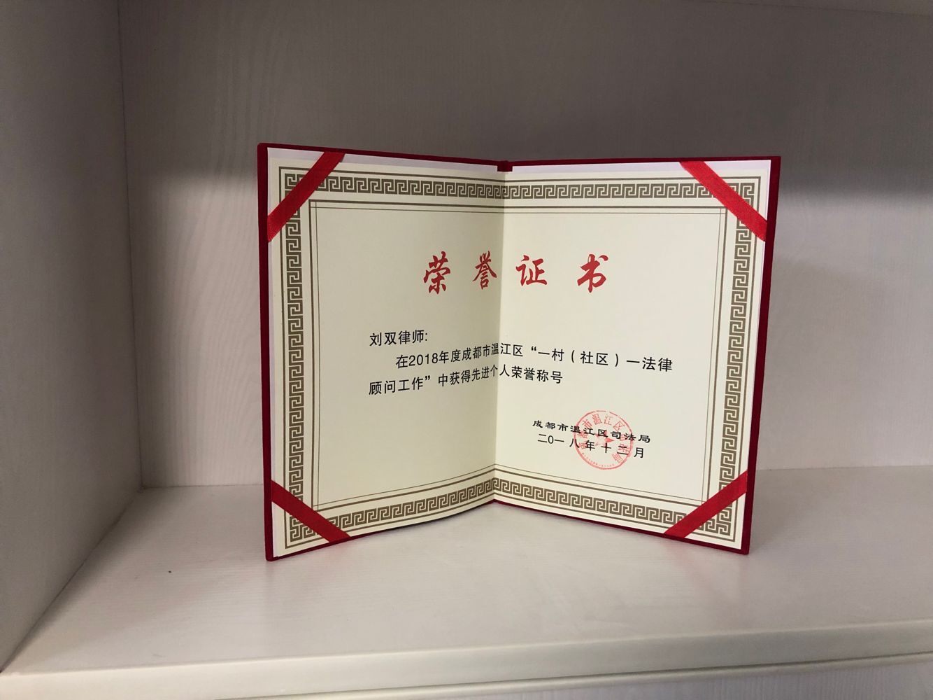 执业律师刘双2018年初开始接触“一村一律师顾问”工作,在温江区永宁镇天王村法律顾问服务活动中处理了大量村民和基层法律事务,期间与刘丹国律师共同撰写完成了一篇“一村一律师顾问”论文。该论文获法学会论文二等奖,刘双律师被温江区司法局评为2018年先进个人荣誉称号。